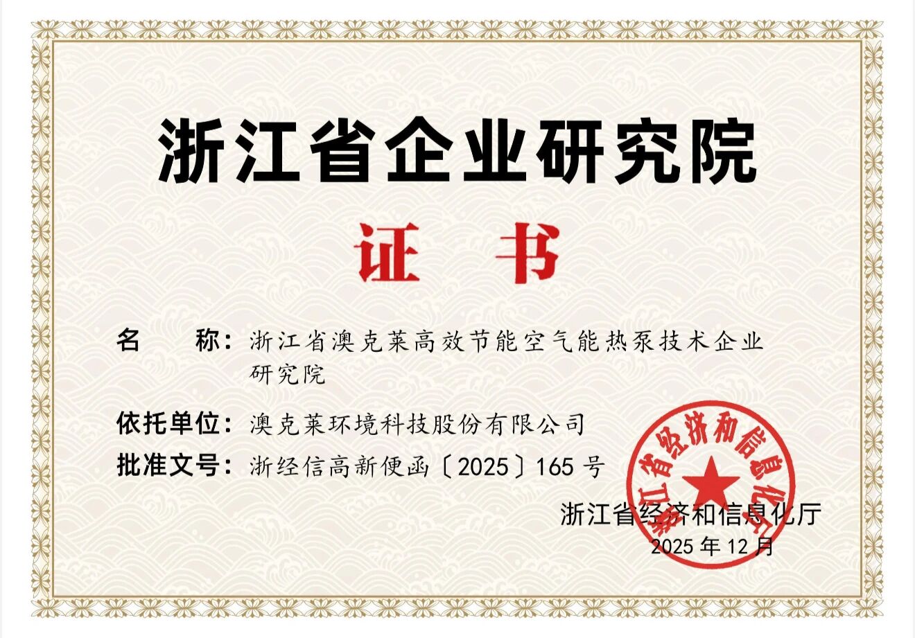 近日,浙江省经济和信息化厅正式发布2025年度省级企业研究院认定名单,澳克莱凭借在空气能热泵技术领域深厚的技术积淀与持续的创新实践,成功获批“浙江省企业研究院” 。